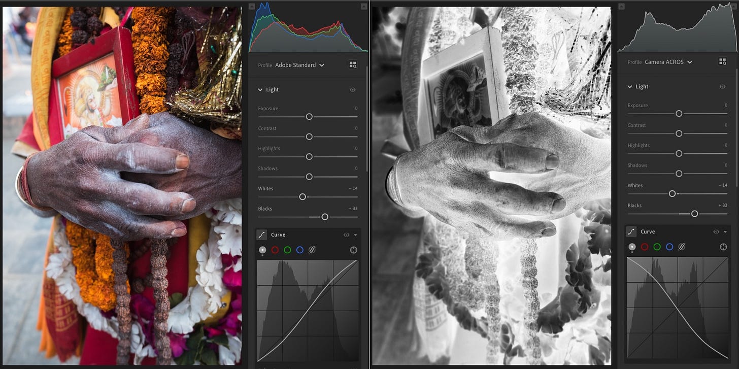 Cyanotype is a contact printing method, which means the size of the physical negative is the size of the final print. So first, you need to create a digital negative. This is a skill in itself and worth spending time on. Apps and presets make this task easier, and Photoshop has an invert option. I freestyled it in Lightroom, reversing the tone curve before changing the colour profile to black-and-white and using other settings to add contrast. Finally, print on a transparent material of your choice. I used tracing paper (A4) because the printers were out of acetate.
