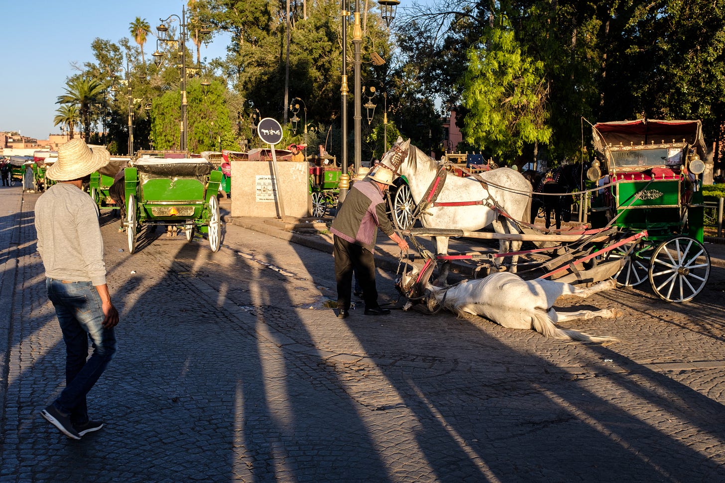 The world is a stage. If we pay enough attention and are alert to the unexpected, we can see things before they happen and be in the right place to capture them. Recently in Marrakech, I noticed a tired horse at the end of a long day. As I watched it park the carriage it was pulling, his leg got tangled in the chains, and he fell to the ground. Seconds later, he was back on his feet. But had I not been awake, I would have missed the moment.