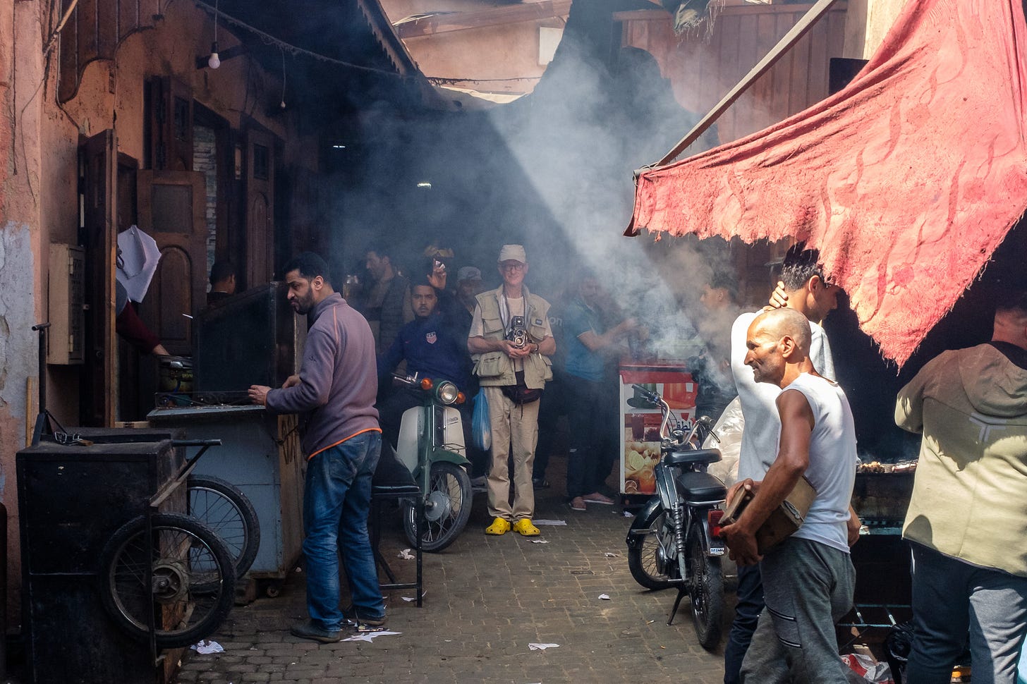 Set in Morocco during and on either side of Ramadan, 2023, the sequence starts with an image I’ve come to think of as a self-portrait. An older gentleman stands in a smoky alleyway carrying a Rolleiflex. Flanked by a local complaining about my photograph, his half-smile and friendly demeanour stare back at me in wistful anticipation of my future self.